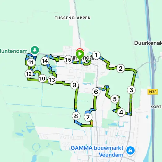 Na een half uurtje trekken we onze, figuurlijke, stoute schoenen weer aan. De route is uitstekend bewegwijzerd, dus verdwalen zit er vandaag niet in. We blijven tot op de laatste halve kilometer in het groen lopen. Pas vlak voor de finish duiken we weer de bebouwde kom van Muntendam in.