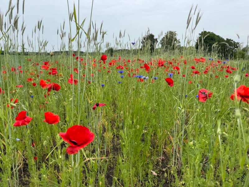 De route is afwisselend. We lopen op graspaadjes, fietspaden en stukken bos. Onderweg, tussen Valthe en Kleindijk genieten we van de prachtige velden en bermen vol met wilde bloemen als klaprozen en korenbloemen. We kunnen wel foto's blijven knippen.